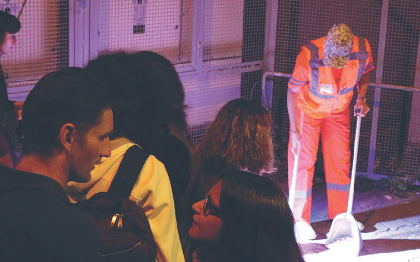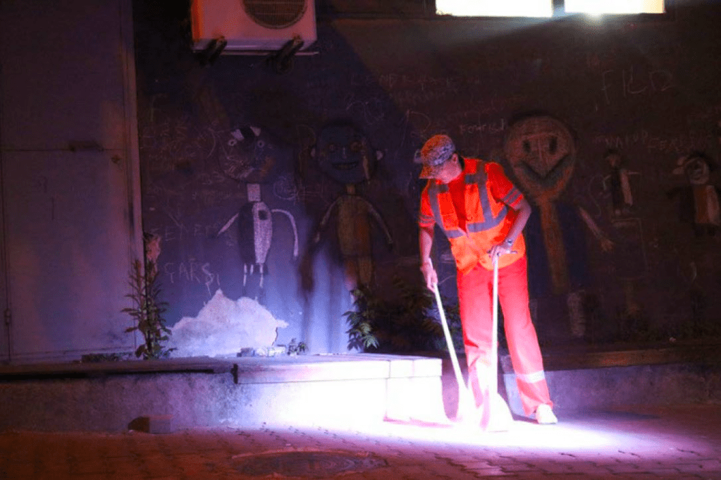 In her work Sweeping (Figure 2224), Torell explores the complexities of public space and the role of those who maintain it. The piece, which was performed in the backyard of the Istanbul-based gallery Depo, finds the artist meticulously cleaning an asphalt surface in the district-specific municipal orange-red summer uniform typically worn by street and park maintenance workers. As she sweeps away gravel and dirt, a searchlight illuminates her, casting her actions in a powerful and evocative light. This performance allowes for reflections on the ongoing conflicts in the city at the time, as well as on those who had the task of cleaning up after the demonstrations and conflicts. She specifically raises questions about uniforms (park attendants, police, and nurces), trying to investigate if attitudes and general respect towards workers wearing uniforms had changed.The artist also raises important questions about the purpose and function of public space, whose history and experiences may be considered to be swept away when it is cleaned. Throughout her performances, Torell exposes herself not only to the audience but also to the unpredictability of public areas. She willingly puts herself at risk and leaves her comfort zone in order to push herself into a state of total presence and experimental fervor in the present moment. She emphasizes the need to be inventive and to juggle with contexts and materials in order to increase concentration for everyone and notes that a successful situation is often one that verges on failure. This concept of ”slight trembling” is key to her work as it allows for experimentation and interaction.