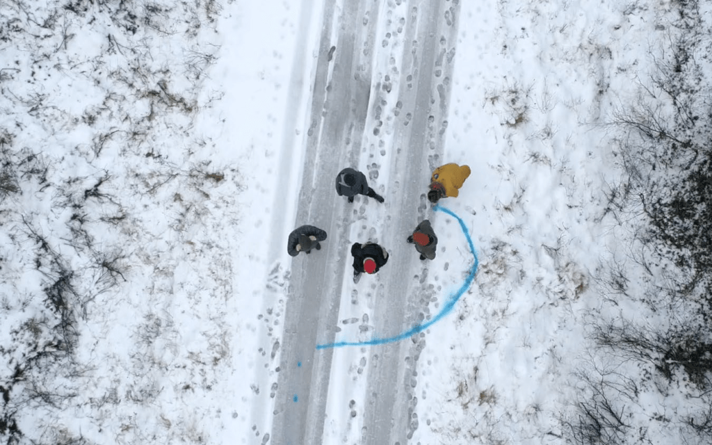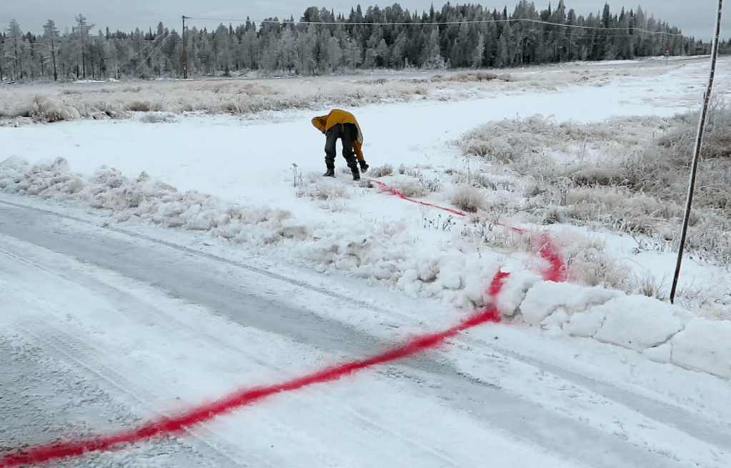 The work What Was Seen, Could Be Seen, was concieved within the interdisciplinary project ”Residency-in-Nature, Mammas hus i Lainio” that Lisa Torell, together with Åasa Jungnelius and Hans Isaksson, were artistic leaders and participants in. The project took place in the northern village of Lainio in Norrbotten, Sweden in 2018 and 2019, where she and other practitioners lived and worked for limited periods during the years. This rural area is the oldest continuously inhabited settlement in the Torne Lappmark. Throughout the history of this area, several mapping acts took place, and some more brutal than others. By using drone filming and environmentally friendly chalk spray Torell wanted to draw attention to the act of mapping; what it does to us, places, landscapes, and regions. Through her participation in the project, the work explored the relationship between public and private spaces, land, landscape, and ownership, hierarchies. It also embraced the differences in working as an artist and as a curator. In a region where mapping has been shaped by the process of Swedification and eugenics, Torell’s work came to reflect on questions about the intersection of these histories and their impact on the present.