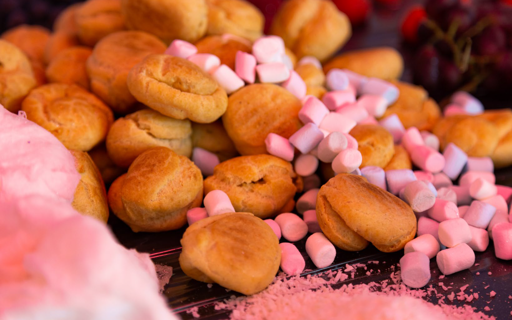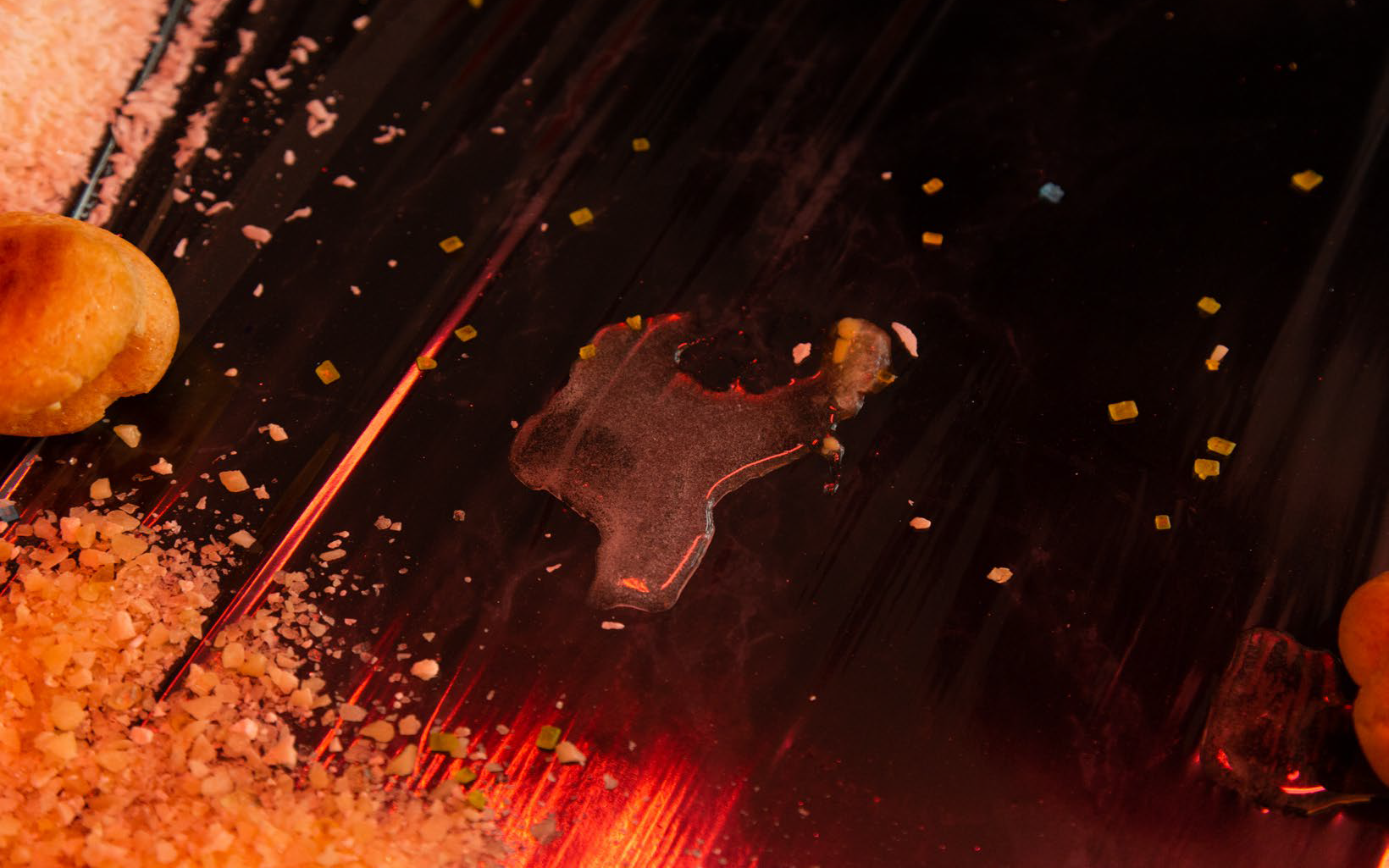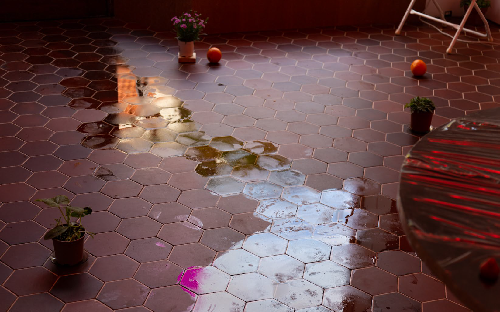 The sound welcomes the audience into a space covered in pink light, with a table in the middle. Here, creamy puffs, fruits, sugary sweets, edible glitter and cream wait to be devoured. A shiny path leads the audience from the door to the table. The path made of sugary water is as sticky as the female voices and glues the audience to the floor. Squeezes of steps join the soundscape while forcing the visiting bodies to acknowledge how their presence leaves traces and activates the space. Two bodies are engaged in serving the audience, slowly heating and brewing syrupy liquid to cover the sweets on the table. The sound lingers and loops.