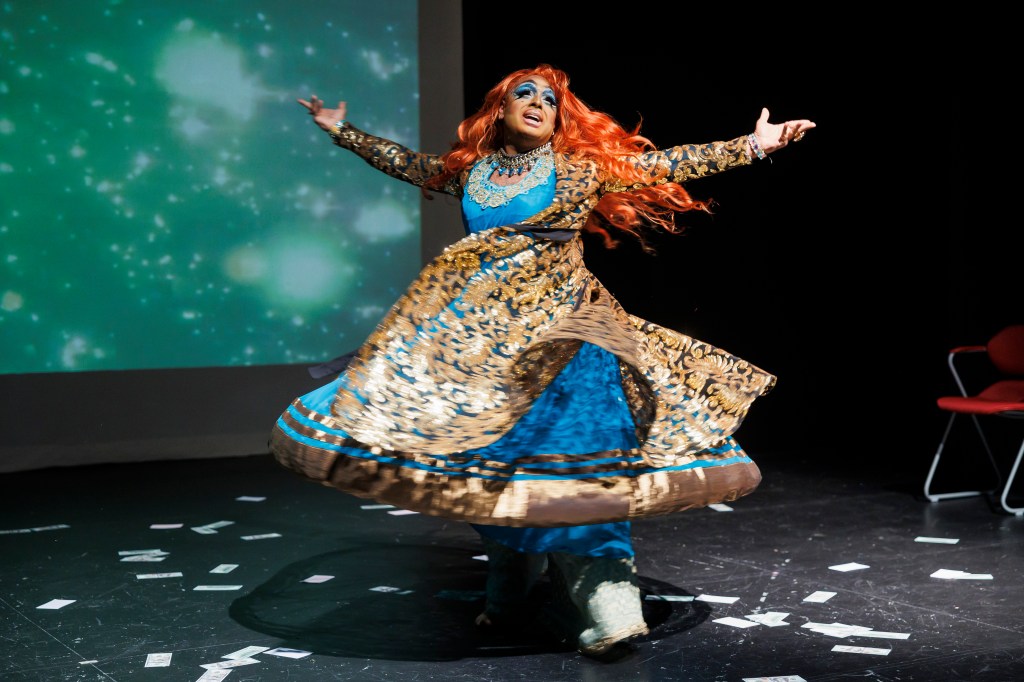 Kareem Khubchandani is an educator, scholar, and drag performer based in Boston, USA. They present their work as ”committed to uplifting the creative ways that minoritarian subjects live inside of oppressive structures,” especially the use of ”dance, fashion, and language to build something more beautiful for each other”. In Decolonize Drag, Khubchandani scrutinises the colonial origins of western gender norms, and how these are reproduced in the drag scene.