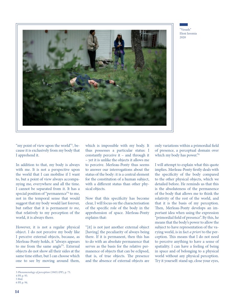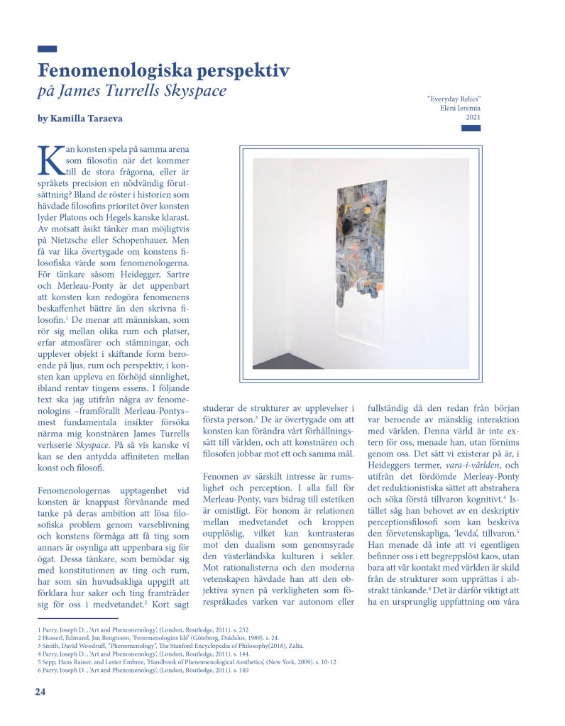 ”Merleau-Ponty skulle nog säga att Turrell faktiskt lyckas utföra det som fenomenologen endast kan drömma om att åstadkomma med ord. Turrells blick har formats av det medium som han har bemästrat, ljuset, vilket gör hans perception unik. Den är finstämd och kan berätta något nytt om världen då den ständigt har pressats av sitt hantverks krav.”