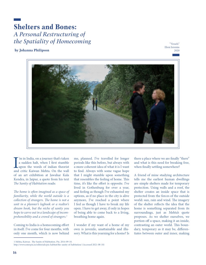 ”As we shelter ourselves, we portion off a space, making it an inside, contrasting an outer world. This boundary, temporary as it may be, differentiates between outer and inner, making the home its own space, not just part of a larger mass. It is because the home is demarcated and limited, that the space becomes overseeable and possible to know and map fully, in contrast to the outside world.”