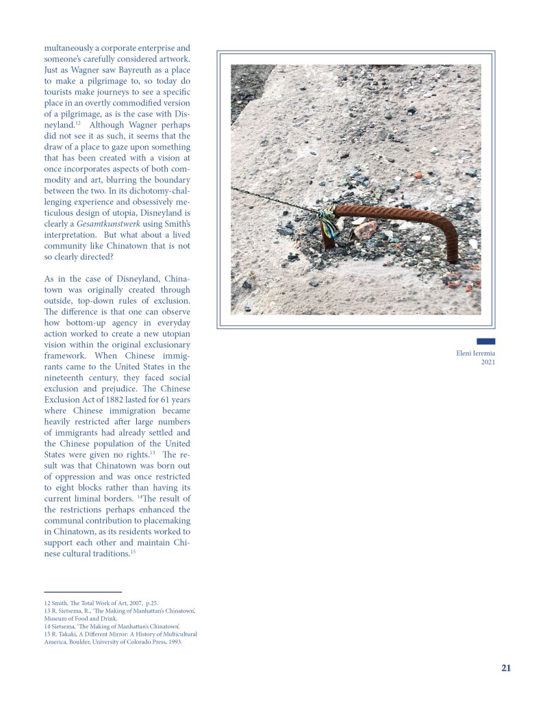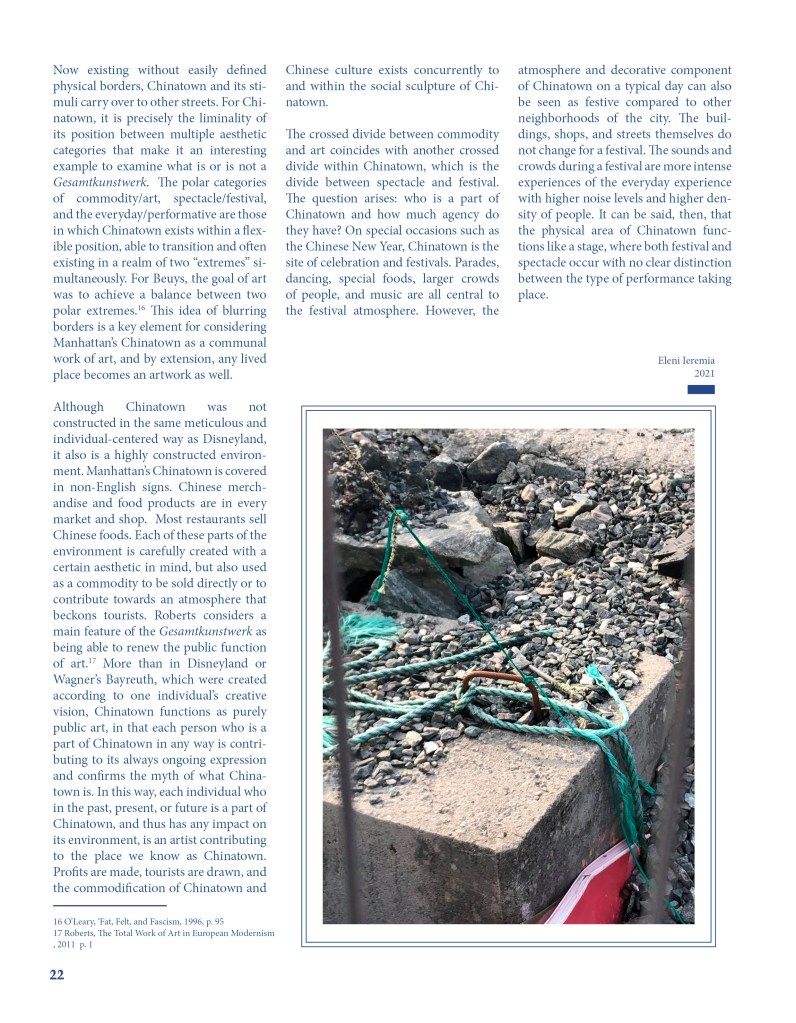 ”Profits are made, tourists are drawn, and the commodification of Chinatown and Chinese culture exists concurrently to and within the social sculpture of Chinatown. The crossed divide between commodity and art coincides with another crossed divide within Chinatown, which is the divide between spectacle and festival. The question arises: who is a part of Chinatown and how much agency do they have? ”