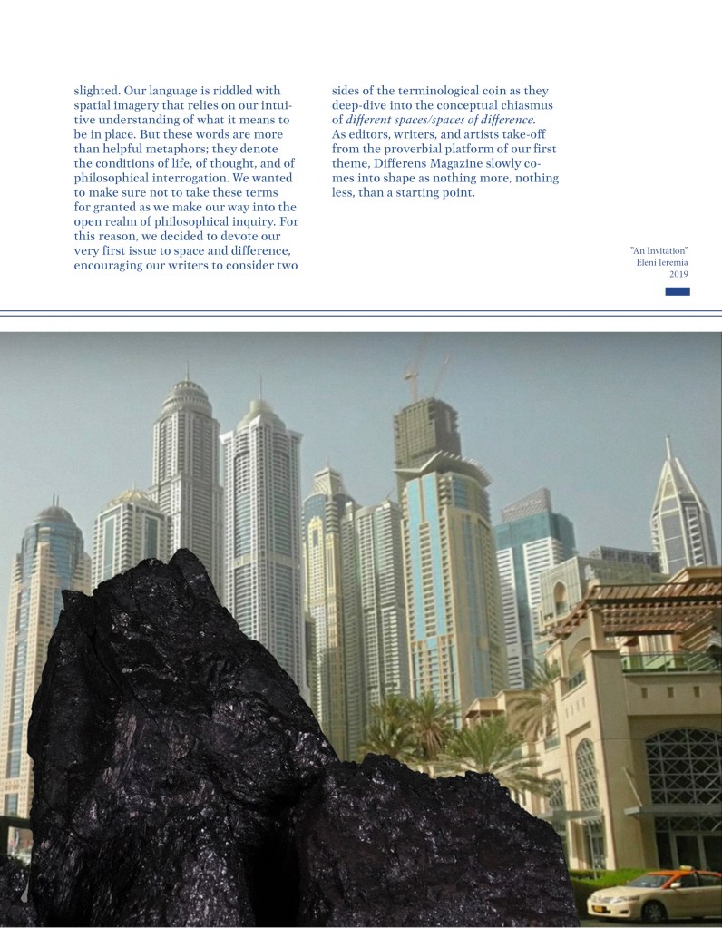 The practical questions we were grappling with were inherently philosophical. They encouraged us to reflect on the spatial origins of terms that are often overlooked, academically, as well as in the everyday; self, other, frame, shape, building, belonging, moving, staying; inherently spatial, yet increasingly slighted. Our language is riddled with spatial imagery that relies on our intuitive understanding of what it means to be in place. But these words are more than helpful metaphors; they denote the conditions of life, of thought, and of philosophical interrogation. We wanted to make sure not to take these terms for granted as we make our way into the open realm of philosophical inquiry. For this reason, we decided to devote our very first issue to space and difference, encouraging our writers to consider two sides of the terminological coin as they deep-dive into the conceptual chiasmus of different spaces/spaces of difference. As editors, writers, and artists take-off from the proverbial platform of our first theme, Differens Magazine slowly comes into shape as nothing more, nothing less, than a starting point.
