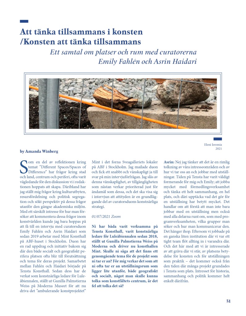 Konsten att tänka tillsammans: Ett samtal om platser och rum med curatorerna Emily Fahlén och Asrin Haidari
