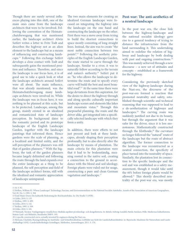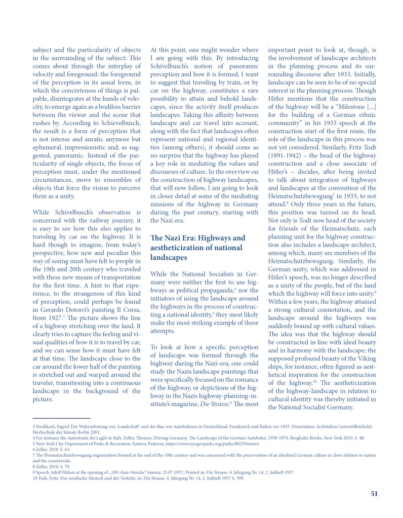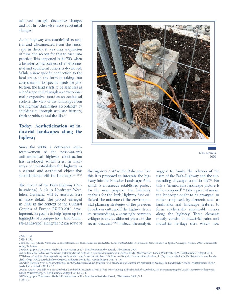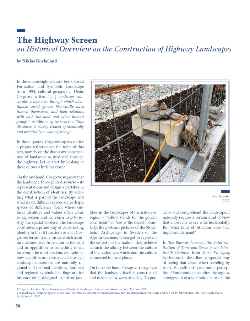 ”[…] the industrial sites are detached from its context as they are abstracted, limited and defined in the window of the frame and as such appreciated as a picturesque view that naturally motivates its preservation. In this process the highway becomes the place of the audience, a field where aesthetical appreciation takes place, where the landscape and cultural identities simultaneously are fixated and codified.”