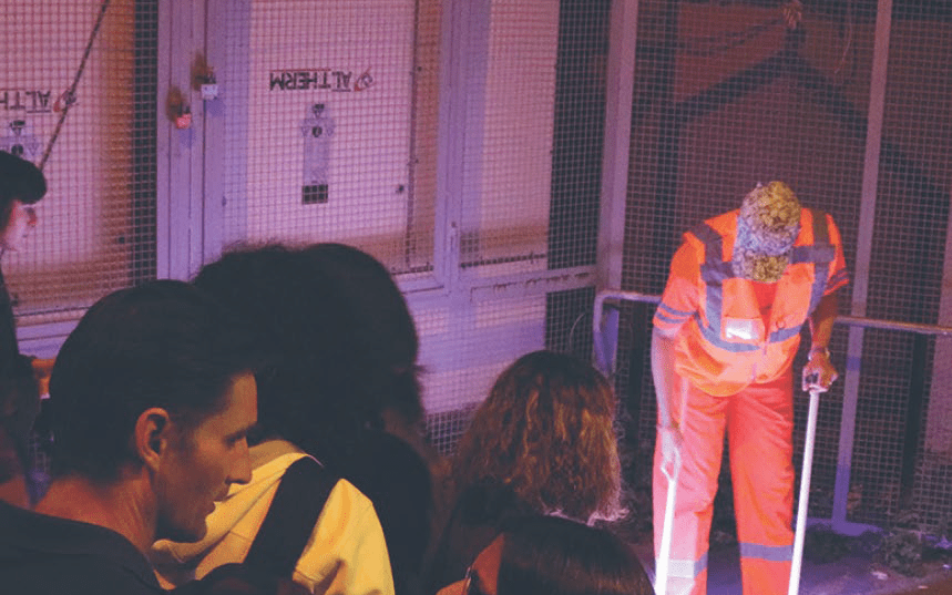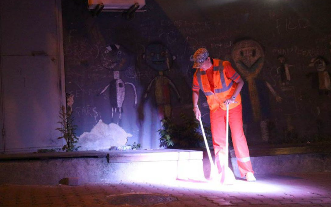 ”As she moved through the city’s narrow alleys, the sound of cans and glass bottles clinking together provided a sensory accompaniment to the work. Take Care of the Garbage exposes as such the gap between the public representation of the city and its unseen workings, and encourages the viewer to consider the impact of identity versus global necessity.”