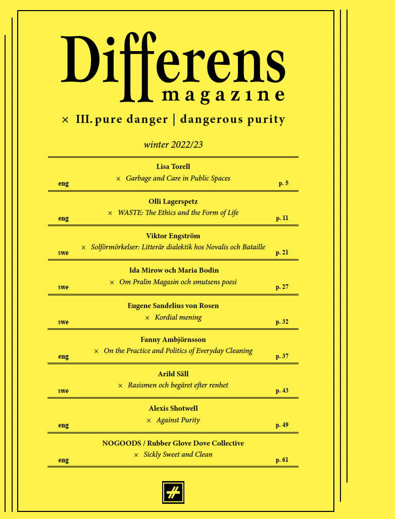 In the third issue of Differens Magazine, we wanted to build on this idea of dirt and pollution, to delve into the nexus of thoughts surrounding purity and its possible dangers. What could notions of national, religious or material purities entail, given that the impure is something ”out of place”? How could we understand spatialities, i.e. national territories, the city, urban districts, our home and personal spaces within such an interrogation?